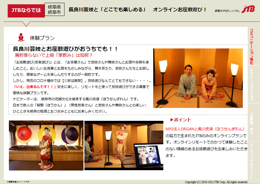 新型コロナウイルスの影響で、旅行・研修などを中止や延期したり、テレワークによるストレスや社員同士のコミュニケーション不足を感じられたり、様々な課題に直面している方もいらっしゃるかと思います。そのような中でオンラインを活用したイベントを実施する企業も増えています。そこで、企業・団体向けのオンラインプログラムをまとめてご紹介。第三弾は「国内オンラインツアー」プログラムです。観光地の魅力に触れる、交流する・・・各地のプログラムをご紹介します。