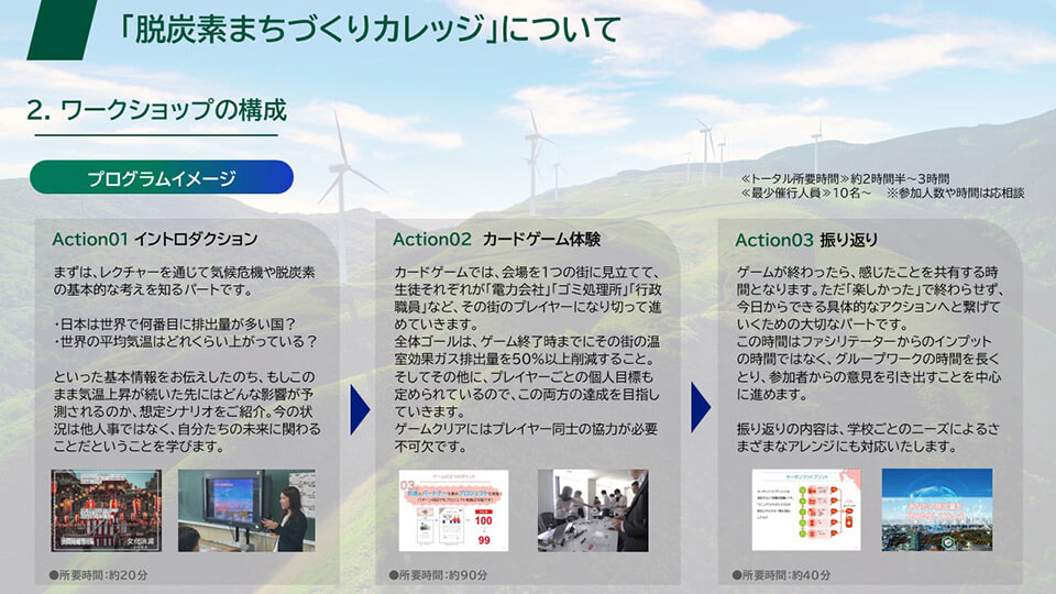 「脱炭素まちづくりカレッジ」は、社員教育・社内コミュニケーション・チームビルディングを同時に実現するゲーム型プログラムです。「脱炭素について理解できた」「ゲームが楽しかった」という学びや感想に留まらず、具体的な行動変容につなげていくことが狙いです。 また、ゲームをきっかけに交流やコミュニケーションを通じた関係性構築ができます。社内で研修やお客様との交流など、幅広いシーンでご活用いただけます。