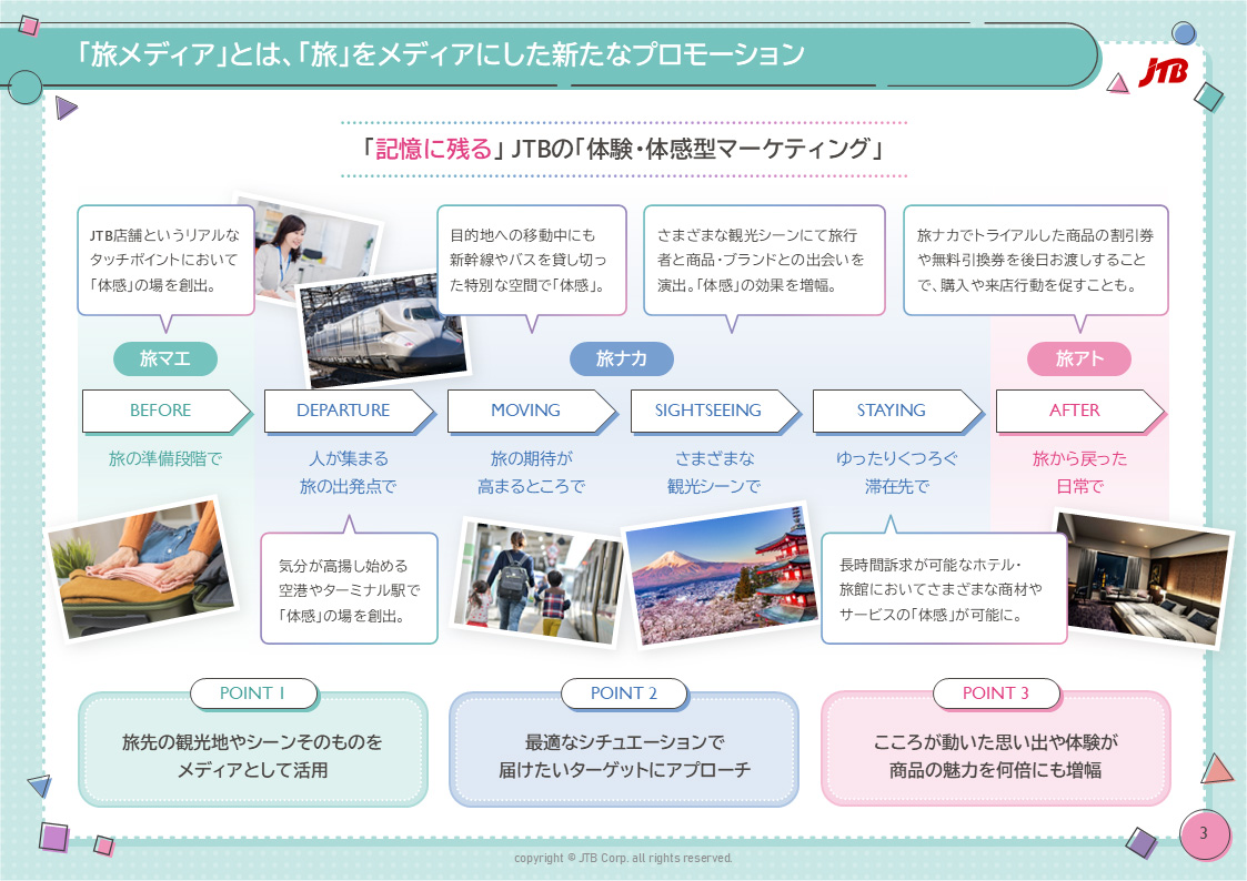 「ヒト」を動かす原動力となり、「モノ」に新たな価値をもたらし、人々の「ココロ」を動かす旅。旅には“カタチ”はありませんが、“チカラ”があります。そんな旅のチカラを活用して、最高のタイミングとシチュエーションで商品を引き立てる、「記憶に残る」JTBの体感型マーケティング「旅メディア」をご紹介します。本資料は、「旅メディア」を活用したプログラム例や、実際に導入いただいた企業様の活用事例をまとめました。ぜひご覧ください。