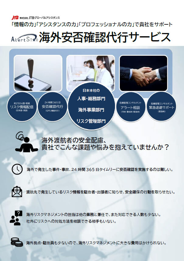 “備えあれば患いなし”社員の安全と企業の信頼性を守るために、海外安否確認代行サービス「アラート☆スター」をぜひご検討ください。