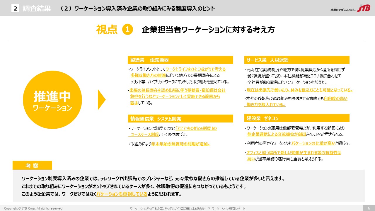 新型コロナウイルスの感染拡大に伴い、従来のようなオフィスに出社する働き方を見直す動きが強まり、オフィス以外を就業場所にできるテレワークの導入が進みました。その1つとしてワーケーションに注目が集まっています。JTBでは、2021年10月~2022年1月に企業の人事総務担当者、従業員等に対して、ワーケーション関する調査を実施しました。本レポートでは、調査結果から、ワーケーション導入企業と未導入企業の違いに焦点を当て、ワーケーション導入のヒントを探ってみました。後段では、参考として弊社JTBのワーケーション制度についても紹介しています。従業員の働き方改革を考える皆さまの参考になれば幸いです。