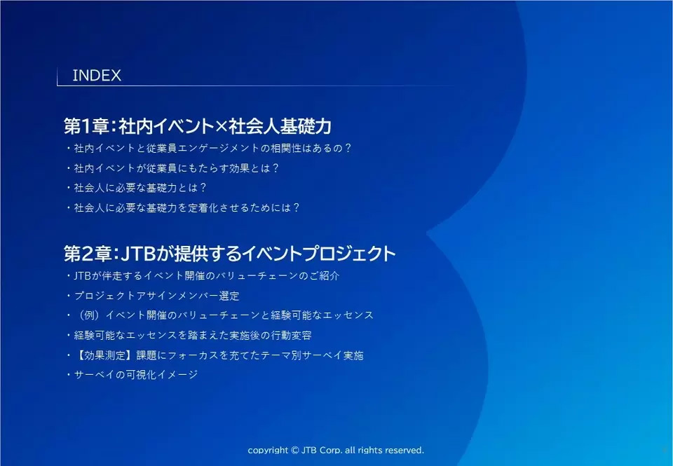 社内イベントという場に対して、自発的に参加したいという従業員を募り、その従業員の方にイベント運営を通じて、モチベーション向上だけではなくスキルも構築することで教育に繋げていけると思っております。 社内イベント運営でみられる従業員エンゲージメントとの相関性や効果などを、本資料で紹介します。また、JTBのイベント伴走の取り組みが、皆さまのお役に立ちますと幸いです。ぜひ、ご覧ください。