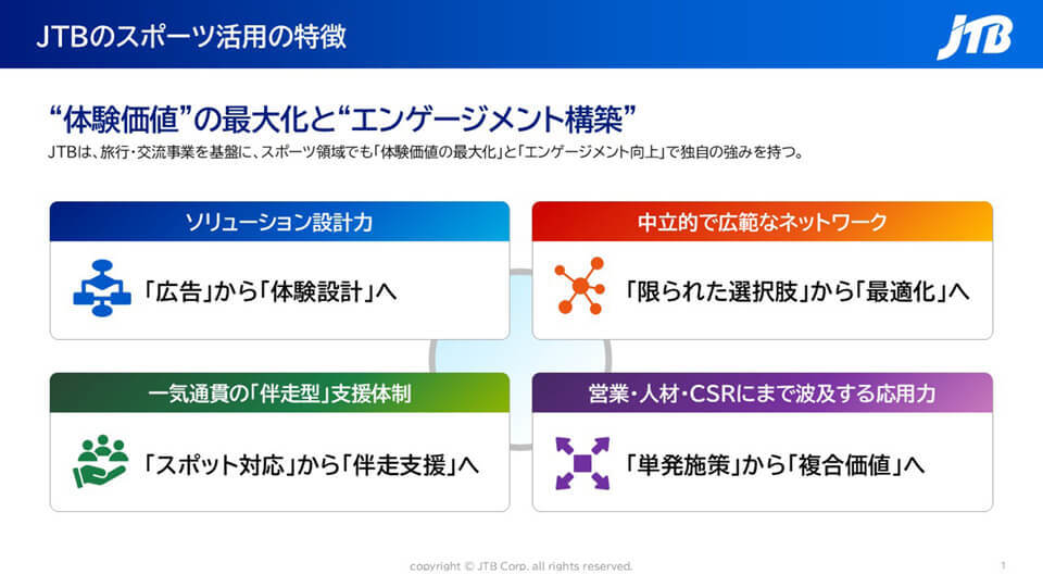 企業活動におけるスポーツの活用は、従来の広告露出やブランド認知にとどまらず、社員・顧客・地域とのエンゲージメントを高める「体験価値」の創出へと進化しています。JTBは、旅行・交流事業で培ったノウハウと広範なネットワークを活かし、スポーツを通じた“共通体験”の力で、企業価値の最大化を支援します。