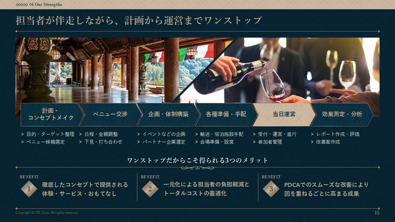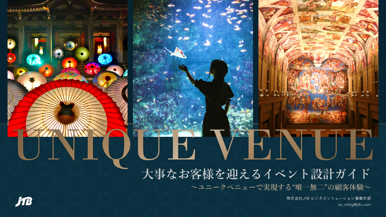 大切なお客様をお迎えするVIP/VIC向け施策では、会場選びから体験設計、当日の運営まで、担当者に求められるクオリティは格段に高まります。本資料では、ユニークベニューの魅力を最大限に活かし、参加者の心に深く残る“唯一無二”の体験を生み出すためのポイントを体系的に整理。会場特性の見極め方、コンセプト構築、ホスピタリティ設計、演出など、すぐに役立つ視点でまとめています。大事なお客様に価値ある体験をお届けしたい方におすすめです。