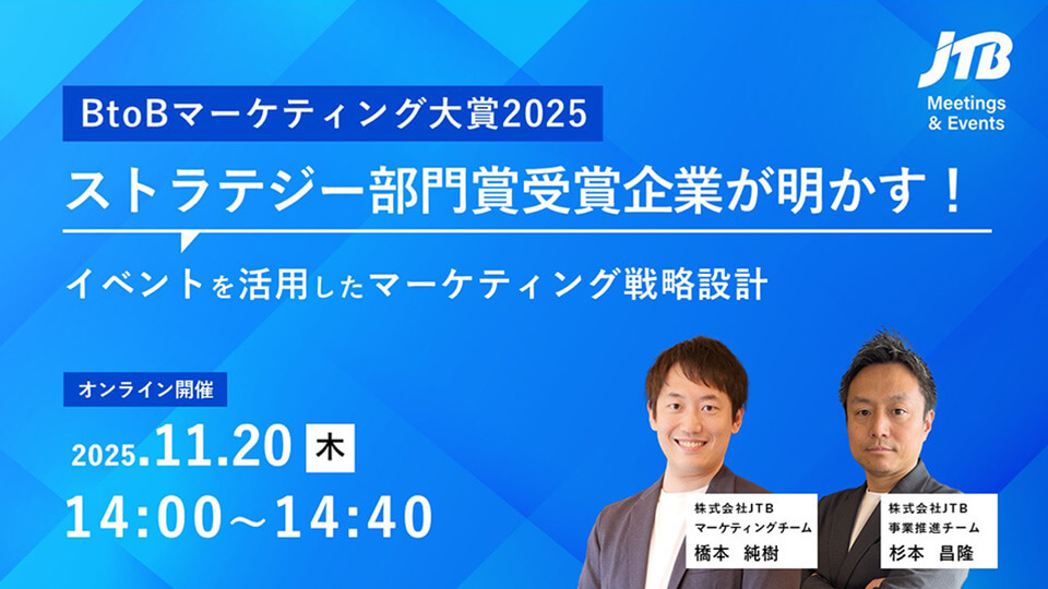 JTBは豊富な独⾃のイベントメソッドで、お客様のイベントを「計画フェーズ」「イベントプロジェクト中」「事後施策」にわたり、ワンストップでサポート。お客様のボトルネックを解消し、リード獲得数や商談化率の向上に貢献することが可能です。マーケティング施策について再考したい。イベントを改善したいと考えるお客様は、ぜひご相談ください。