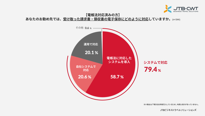 電帳法改正で義務化された、電子取引の電子保存へ対応している企業は86%にのぼり、内59.8%の企業では、スキャナ保存まで対応済みであることがわかりました。また、対応方法については、79.4%の企業がシステムで対応しており、運用で対応している企業は少数派であることが明らかとなりました。