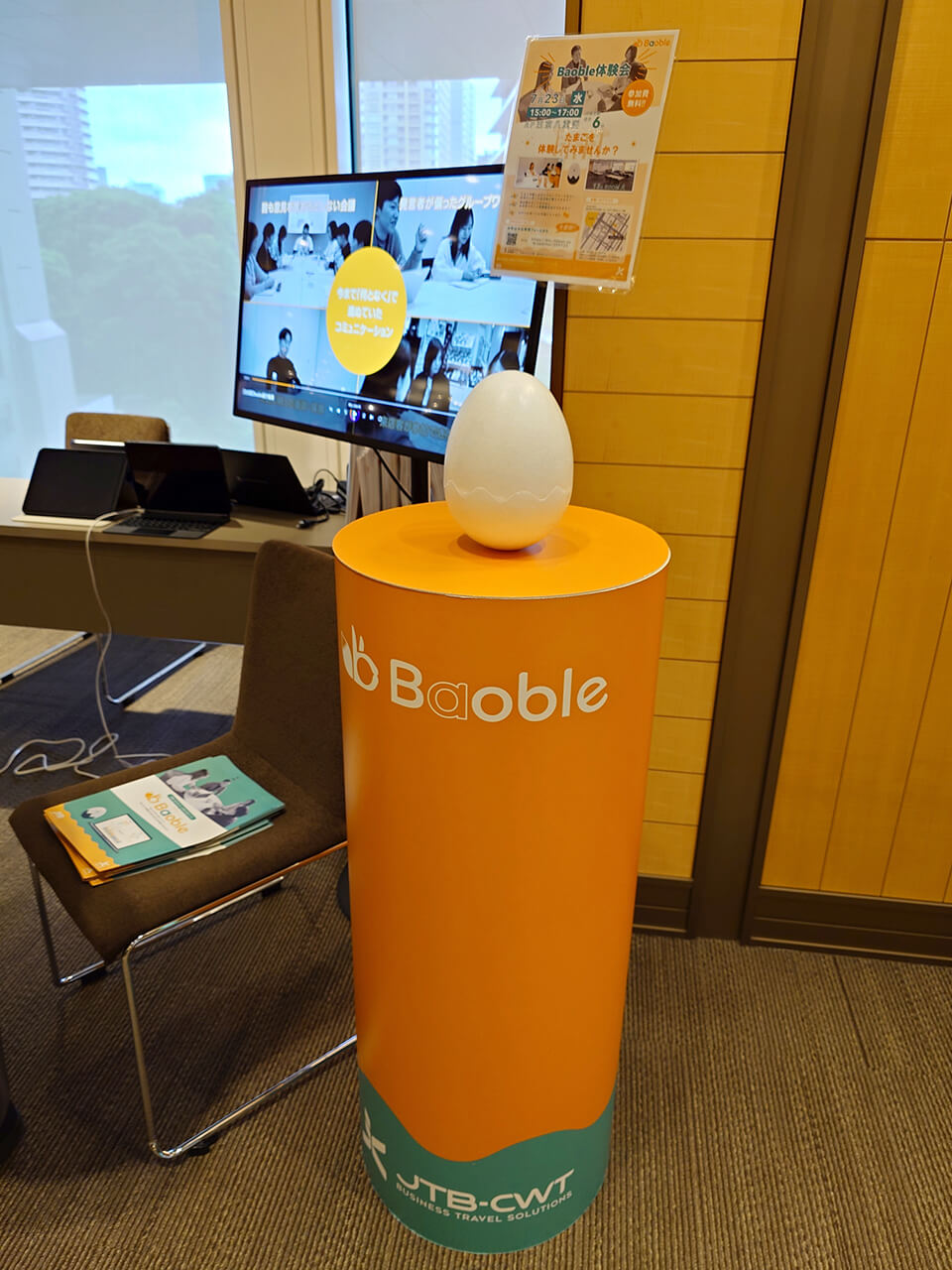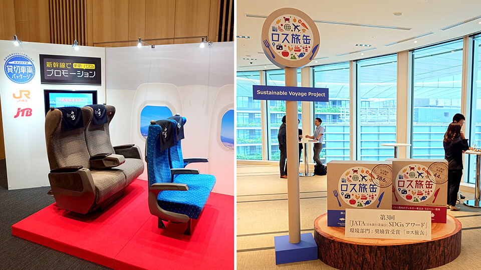 - 第3回「JATA SDGsアワード」環境部門で奨励賞を受賞した、未利用食材を活用した缶詰「ロス旅缶」がお土産として用意され、巨大オブジェとともに展示されました。