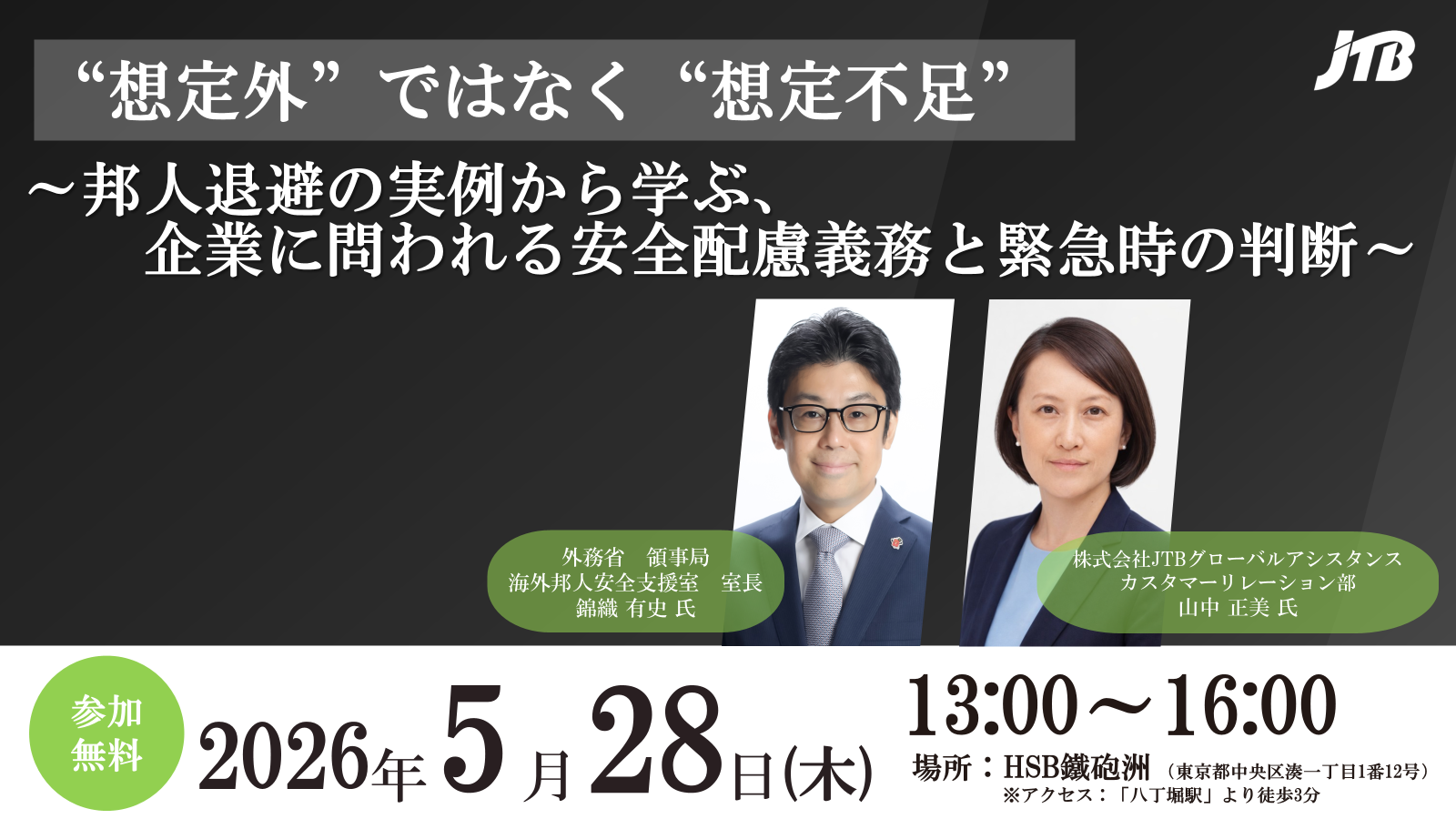 2026年05月28日(木) リアル会場 “想定外”ではなく“想定不足” ~邦人退避の実例から学ぶ、企業に問われる安全配慮義務と緊急時の判断~ 2026年5月28日(木) HSB鐵砲洲 会議室 アウトソーシング・ 業務委託(BPO) ビジネストラベル