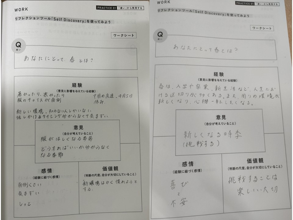 このプログラムでは、リフレクションの第一人者である熊平美香氏の監修によるリフレクションツール「 Self Discovery 」を使った授業用教材を活用しています。自分の内面にある課題意識に気付くことを通じて、自己の在り方や生き方につながる探究課題を設定することができるようになります。