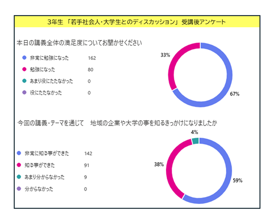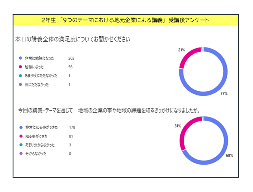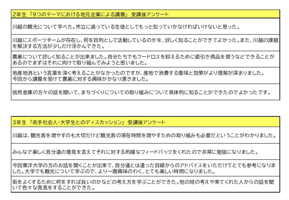 また、生徒からの感想からも地元企業や組織の方から話を聞くことで、地域について深く知り、課題を改善していくための学びを深めることが出来たことが窺えます。
