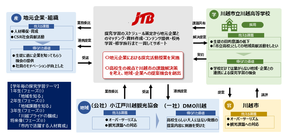 そこで、すでに産官学共創から地域活性事業を展開していたJTB川越支店と連携し、生徒の学びの充実と地域の活性化を実現するため、総合的な探究の時間の中で、地域課題解決を推進していくこととなりました。