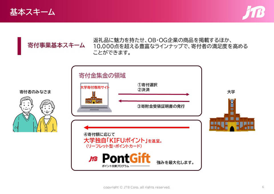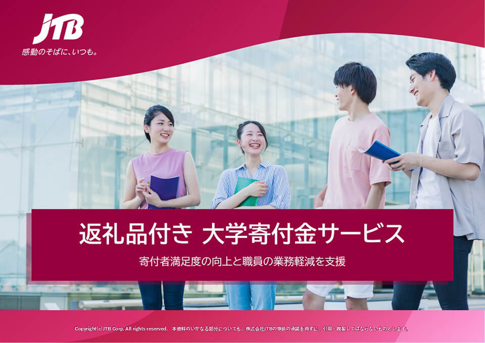 「返礼品付き 大学寄付金サービス」は、「寄付を集める仕組み」と「業務負担の軽減」を同時に実現するトータルソリューションです。専用Webサイト構築から返礼品管理、寄付金管理、マーケティング支援まで、寄付事業を成功に導くためのすべてをワンストップで提供します。大学・寄付者・OB・OGをつなぐ新しいコミュニケーションを創出します。