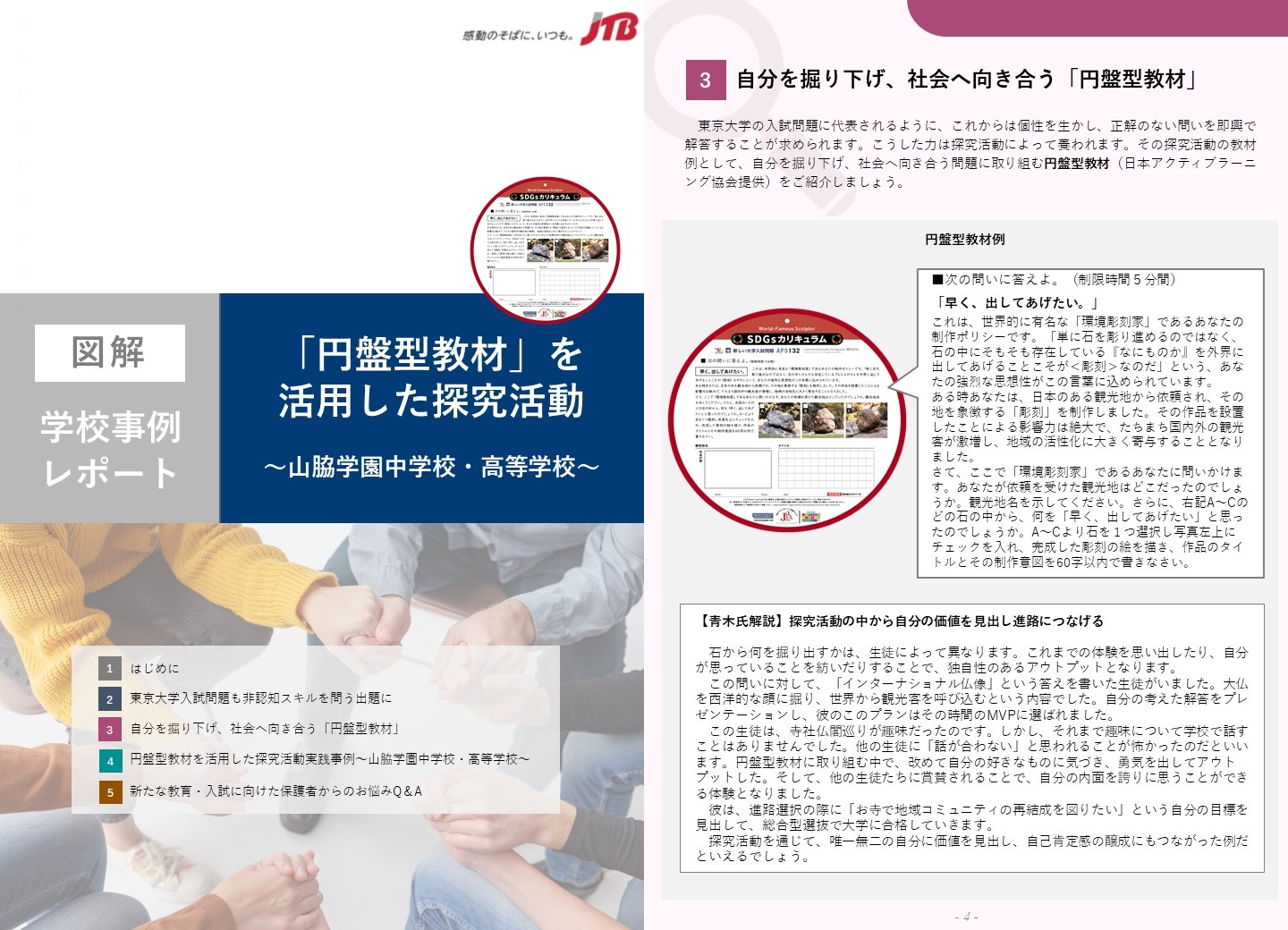 記事ではお伝えしきれなかった「円盤型教材」の内容や、この教材を活用して探究学習を実践している学校の事例をレポートにまとめました。レポートでは「円盤型教材」の問題サンプルや、学校の具体的な取り組み内容、取り組みの成果がご覧いただけるほか、青木唯有氏が保護者の不安や疑問に答えるコーナーもご用意しました。探究活動のヒントが詰まったこの一冊を、御校の探究指導に是非お役立てください。
