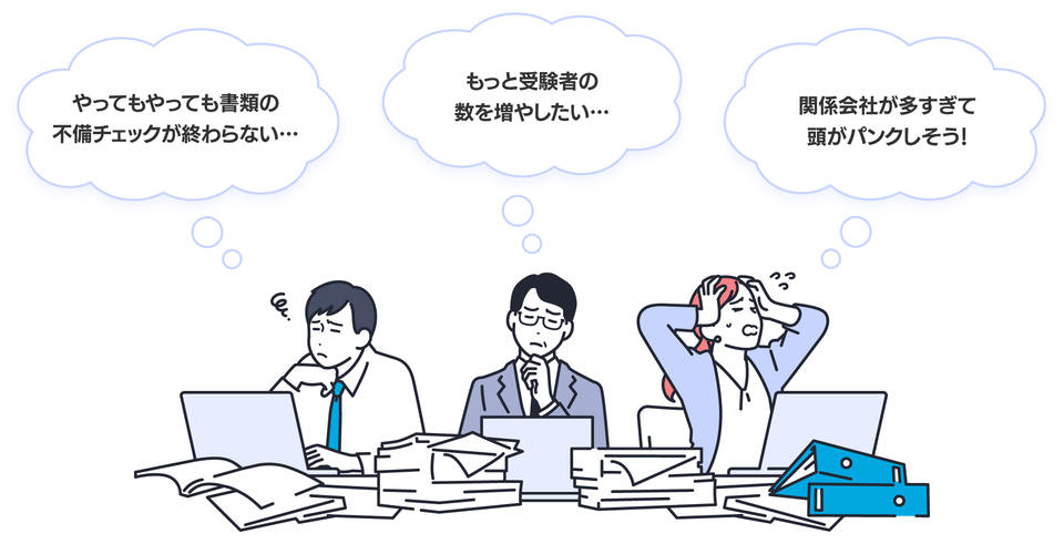 - 書類確認や受験票の作成・発送など、膨大な単純作業が発生している