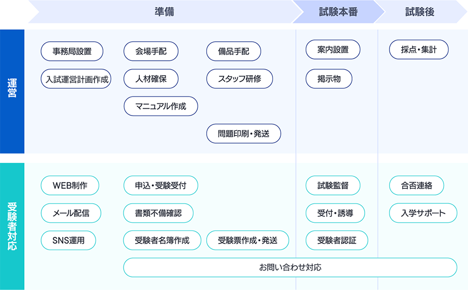 当日の受付や誘導、試験監督などの運営業務、試験後の合否通知など、幅広い業務のサポートが可能です。