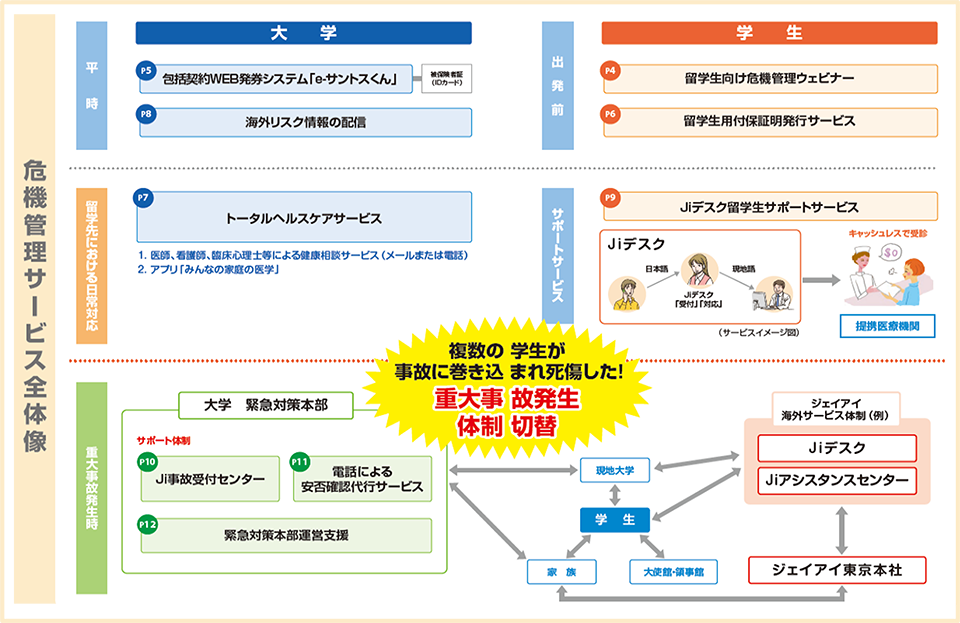 ジェイアイでは、海外旅行保険の事故対応の豊富な実績と海外主要都市の現地窓口「Jiデスク」のネットワークを活用することで、海外旅行保険(企業包括契約)+旅行事故対策費用保険の保険料を変更することなく、新たなメリットとして「危機管理サポートサービス」を提供してまいります。また、危機管理における窓口を一本化することで、事故時においても、よりスムーズなご対応が可能となります。