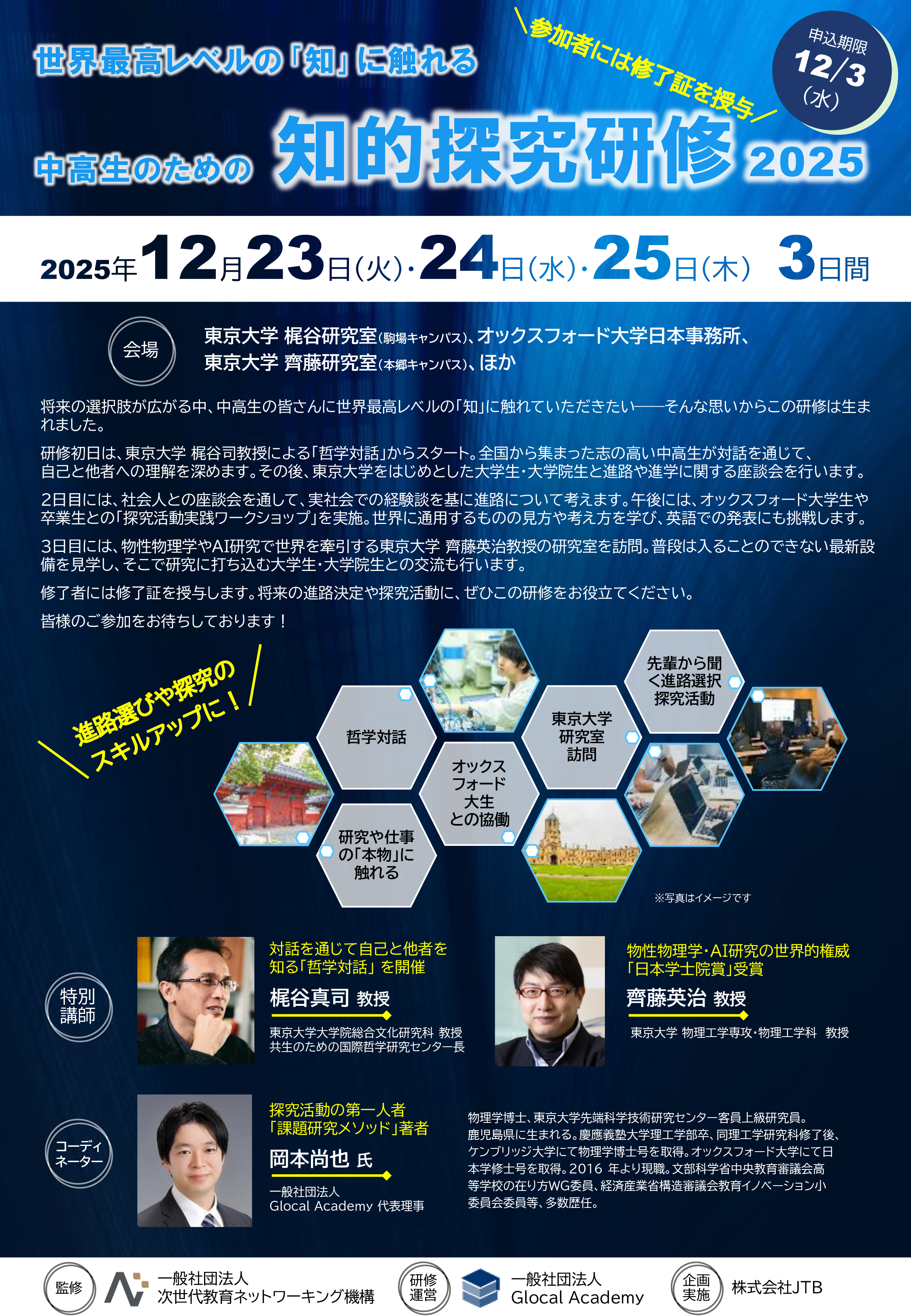 全国の中高生が世界トップレベルの研究者やビジネスマン、オックスフォード大学の学生に出会い、自分の視野を広げる―。そんな「知的探究研修」が2023年12月25~27日の3日間、都内で開催されました。