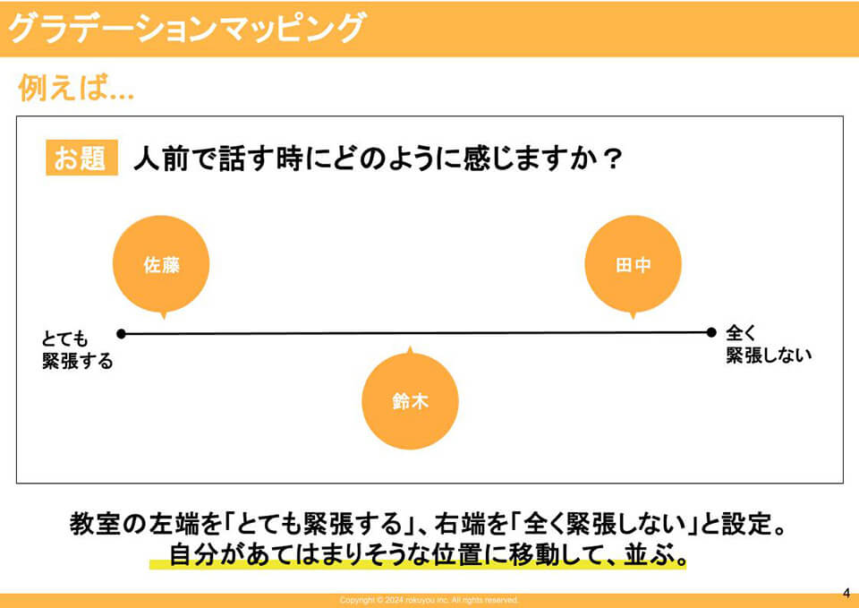 そこで、まず取り組んだのが、SELの視点を取り入れた新入生オリエンテーションです。具体的には、全クラスで生徒同士が安心して交流できるよう、グラデーションマッピングを実施しました。