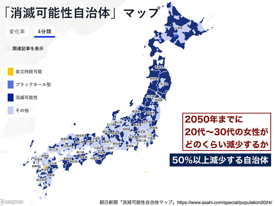 このデータは2020年と比較して、2050年までに20~39歳の女性人口がどれだけ減少するかを示した地図で、濃い青ほど減少幅が大きいことを表します。地図全体を覆う深いブルー(消滅可能性自治体)が、全国の多くの自治体で若い世代が著しく減少することを示唆しています。