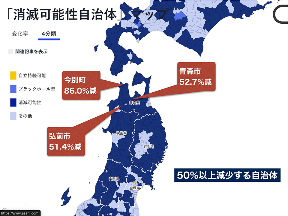 また中でも青森市では52.7%減、弘前市では51.4%減、今別町に至っては86%減。この数字は、地域コミュニティの担い手が急激に減少し、行政サービスや教育環境にも影響が及ぶことを意味しています。