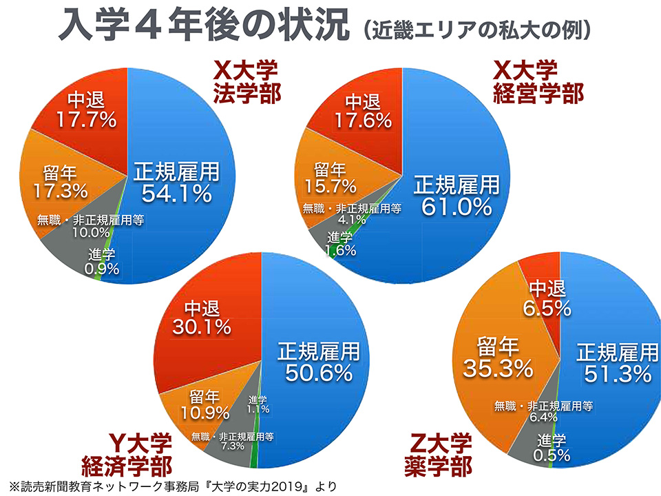 現在、4年制大学への進学率は過半数を超えています。4年制大学への進学は身近になっている一方、入学後のイメージは出来ているでしょうか。以下は全国の大学の進学4年後の状況を調べた読売新聞社が出している調査結果の抜粋です。