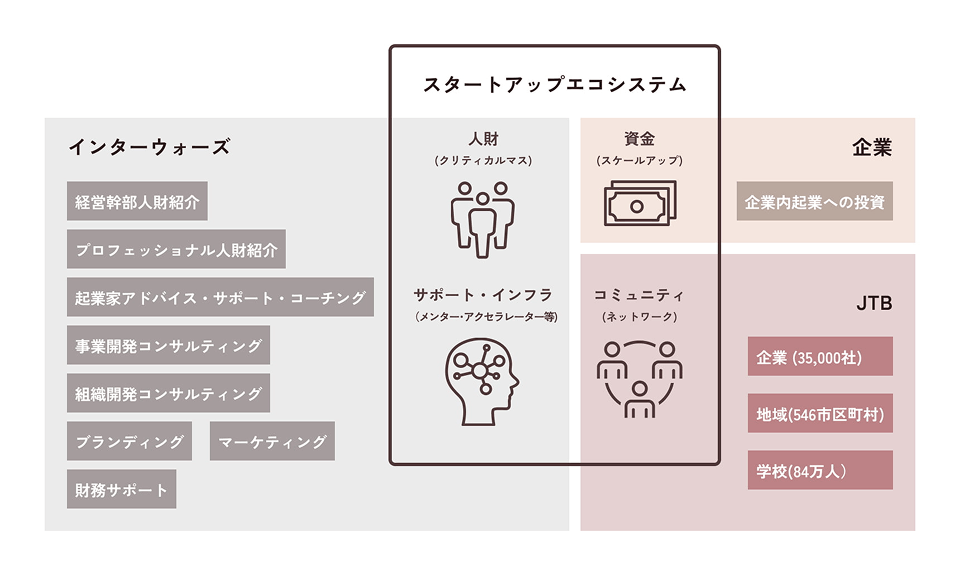 「人をコアにしたインキュベーション」に長年取り組んできたインターウォーズ㈱の機能と「人・企業・地域」と長年繋がってきた㈱JTBの顧客基盤を掛け合わせる事で企業の資金を活用したスタートアップ・エコシステムを構築します。