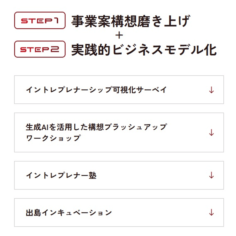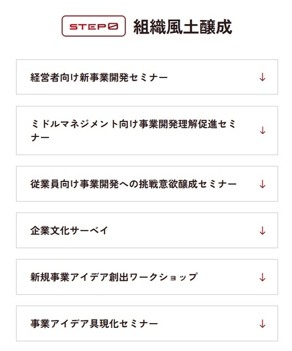 STEP0、1、2には事業開発風土醸成、事業案磨き上げに資する様々なサービスがございます。