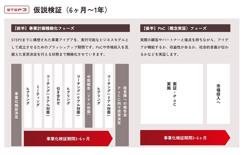 事業化に向けた最終段階として、精密な事業計画の構築からPoC(概念実証)の実施までを一貫して支援します。期間はプロジェクトによって異なりますが、通常6ヶ月~1年をかけて実施します。このフェーズは、次の2つの期間に分けて構成されています。